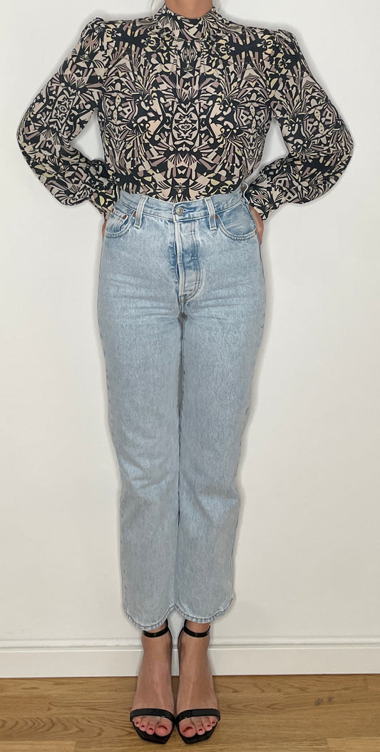 Moderne geometrisch gemusterte Bluse aus Seide mit Stehkragen und Ballonärmeln